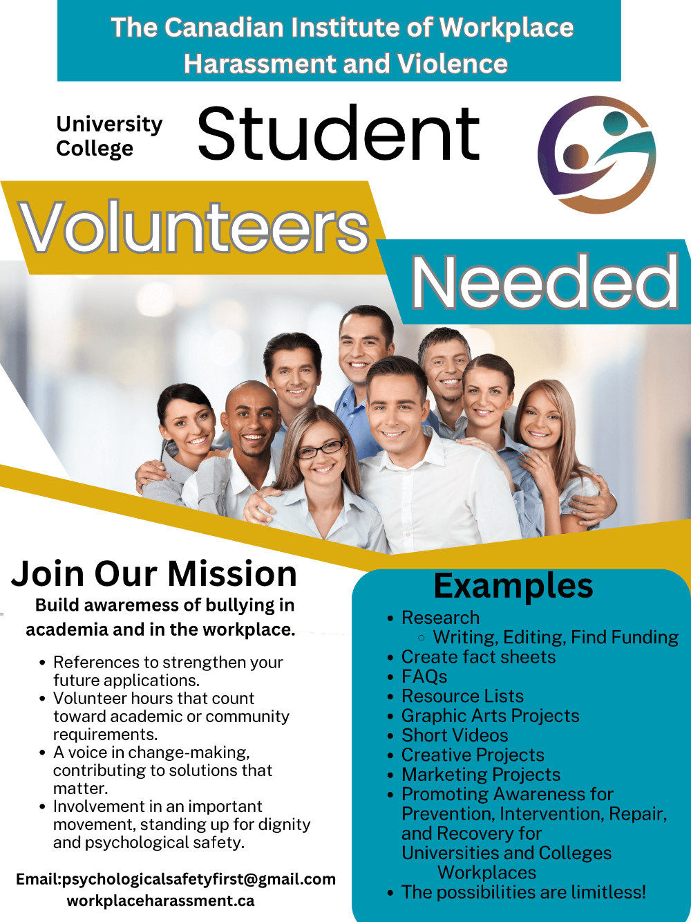 We are looking for student volunteers from universities and colleges to join our missing and help build awareness of bullying in academia and the workplace. If you are interested in having a voice in change-making and contributing to solutions that matter, please email psychologicalsafetyfirst@gmail.com.